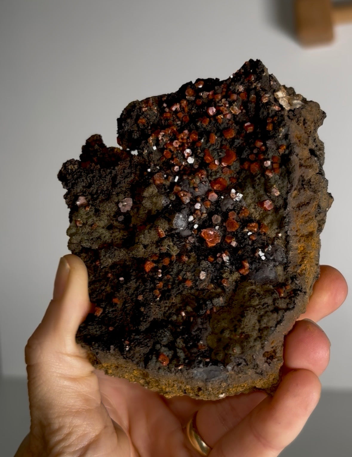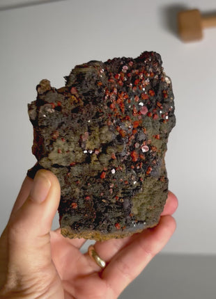 Red Vanadinite with Silky Black Coronadite. Uncommon Vanadinite specimen. From an older find. Origin: Taouz Caidat, Er-Rissani Cercle, Sahara Desert, Morocco... Read more