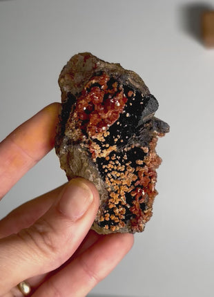 Red Vanadinite with Silky Black Coronadite. Uncommon Vanadinite specimen. From an older find. Origin: Taouz Caidat, Er-Rissani Cercle, Sahara Desert, Morocco... Read more
