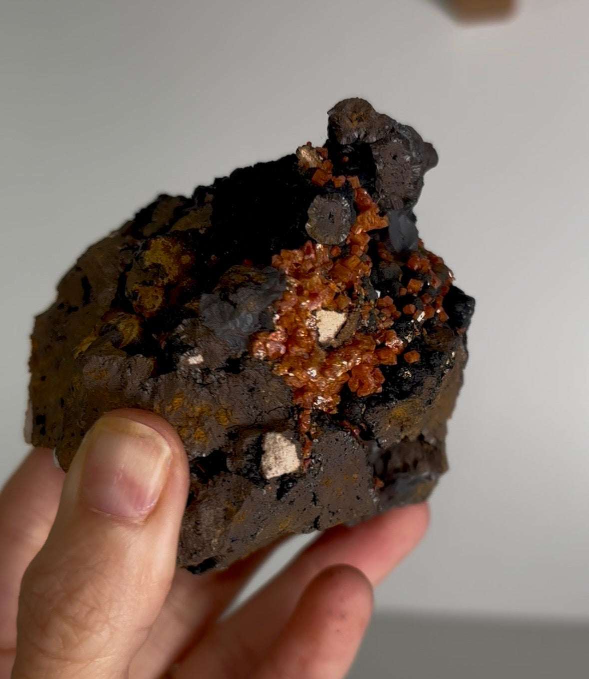 Red Vanadinite with Silky Black Coronadite. Uncommon Vanadinite specimen. From an older find. Origin: Taouz Caidat, Er-Rissani Cercle, Sahara Desert, Morocco... Read more