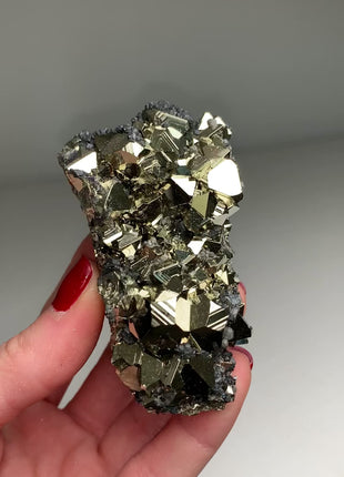 Very high grade Pyrite with great luster Origin: Huanzala, Peru Size: 78 x 47 x 38 mm Weight: 213 gr Read more
