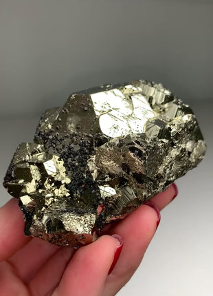Very high grade Pyrite with great luster Origin: Huanzala, Peru Size: 78 x 58 x 22 mm Weight: 329 gr Read more