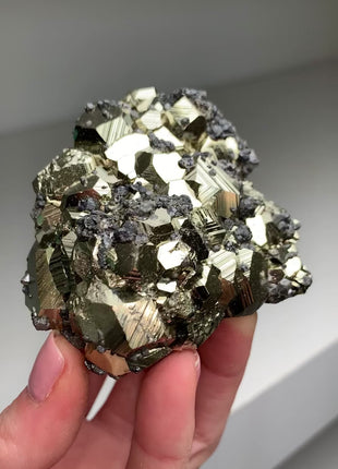 Very high grade Pyrite with great luster Origin: Huanzala, Peru Size: 77 x 74 x 48 mm Weight: 345 gr Read more