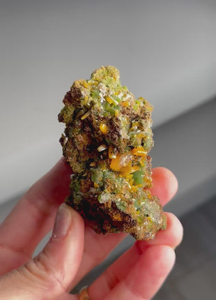Botryoids of rich green mimetite with deep amber-colored, wulfenite. 2009 find From Ojuela Mine, Mapimí, Mapimí Municipality, Durango, Mexico. Read more