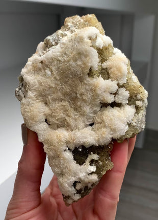 Yellow Fluorite with White Barite From: Moscona mine, Asturias, Spain Size: 120 x 90 x 55 mm Weight: 493 gr Read more